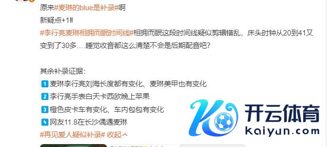 根据网友的发现,麦琳、李行亮邀问候安调和和后续相拥而眠这段疑似补录,不仅时辰线参差,安安还能精确知说念前期两东说念主发生的事,而李行亮麦琳休眠不隐痛录像头就算了,还有录像头能怼着两东说念主的脸拍,再加上李行亮前后所带的腕表以及麦琳提的包齐有收支,使得“补录洗白”言论甚嚣尘上。