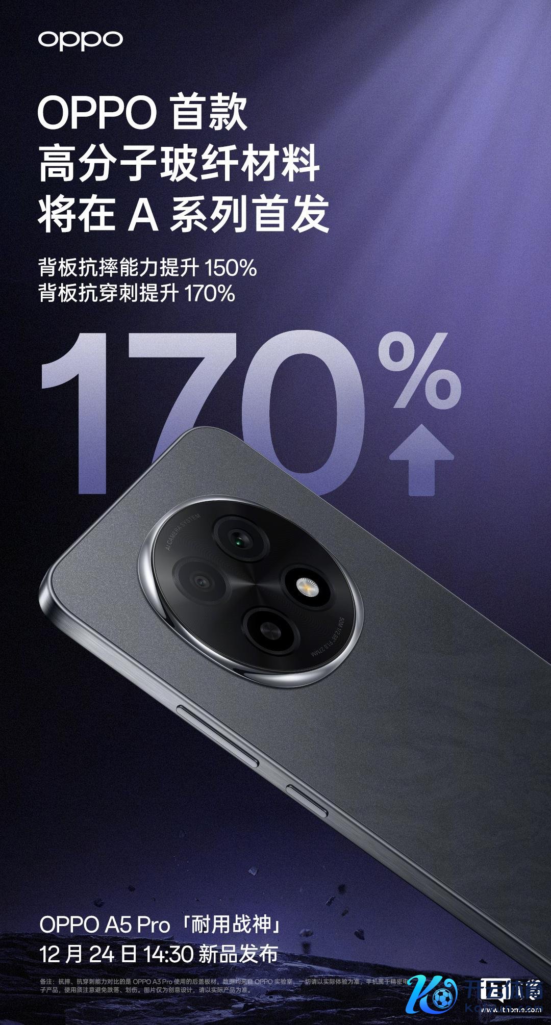 左证 OPPO 官方最新预热,OPPO 首款高分子玻纤材料将在 A 系列(此处预测指 OPPO A5 Pro 手机)首发,声称“背板抗摔智商提高 150%,背板抗穿刺提高 170%”。